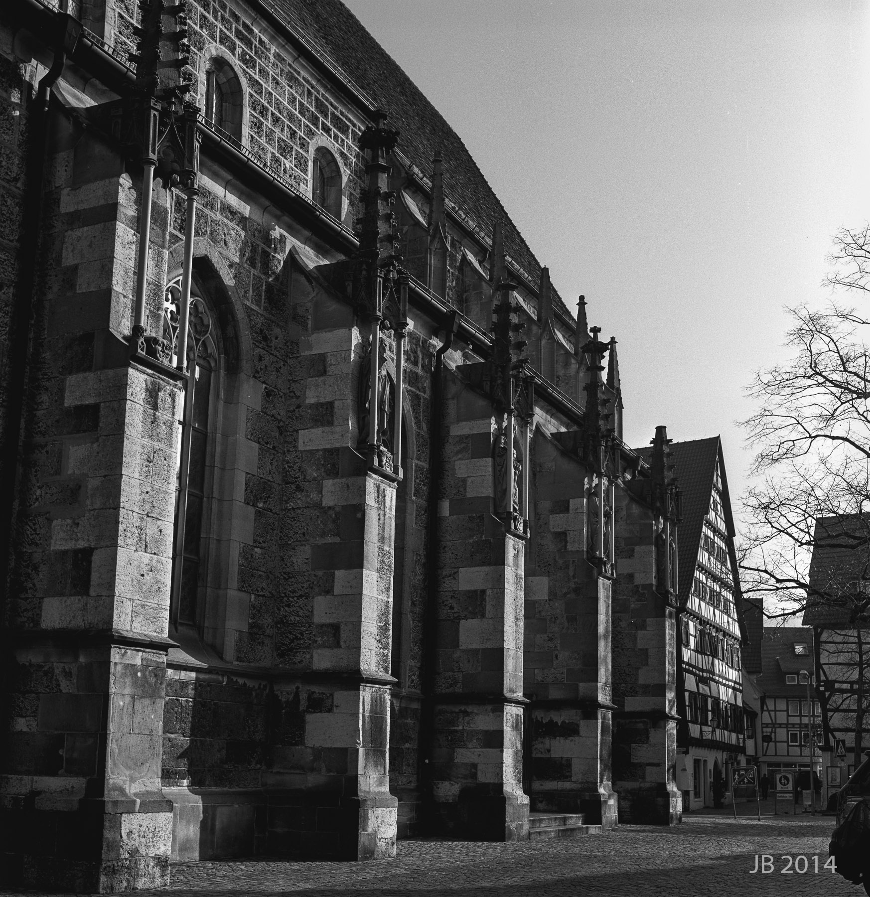 Die Bismarck-Linde spielte ganz wunderbar auf der Amanduskirche. Vielleicht sollte man das nächste Bild mit mehr Kontrast / Schwärzung in dem Baumschatten entwickeln. Der restliche Kontrast ist angemessen aber Baumschatten nehme ich immer deutlicher wahr.